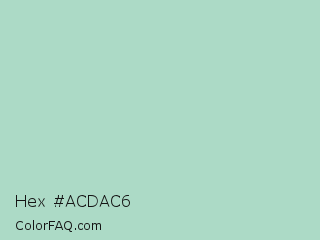 Hex #acdac6 Color is a light green color and the nearest color is Fringy Flower #b1e2c1. Hex code #acdac6 and RGB value is rgb(172,218,198). In RGB color space, this color is composed of 67% red, 85% green, 78% blue, In CMYK color space, this color is composed of 21% cyan, 0% magenta, 9% yellow , 15% black , In HSL color space, this color has a hue angle of 154° , 38% saturation and 76% lightness.