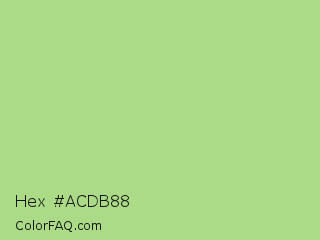 Hex #acdb88 Color is a light green color and the nearest color is Feijoa #9fdd8c. Hex code #acdb88 and RGB value is rgb(172,219,136). In RGB color space, this color is composed of 67% red, 86% green, 53% blue, In CMYK color space, this color is composed of 21% cyan, 0% magenta, 38% yellow , 14% black , In HSL color space, this color has a hue angle of 94° , 54% saturation and 70% lightness.