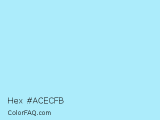 Hex #acecfb Color is a very light cyan color and the nearest color is Fresh Air #a6e7ff. Hex code #acecfb and RGB value is rgb(172,236,251). In RGB color space, this color is composed of 67% red, 93% green, 98% blue, In CMYK color space, this color is composed of 31% cyan, 6% magenta, 0% yellow , 2% black , In HSL color space, this color has a hue angle of 191° , 91% saturation and 83% lightness.