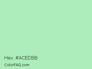 Hex #acedbb Color is a light green color and the nearest color is Chinook #a8e3bd. Hex code #acedbb and RGB value is rgb(172,237,187). In RGB color space, this color is composed of 67% red, 93% green, 73% blue, In CMYK color space, this color is composed of 27% cyan, 0% magenta, 21% yellow , 7% black , In HSL color space, this color has a hue angle of 134° , 64% saturation and 80% lightness.