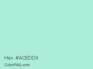 Hex #acedd9 Color is a light green color and the nearest color is Magic Mint #aaf0d1. Hex code #acedd9 and RGB value is rgb(172,237,217). In RGB color space, this color is composed of 67% red, 93% green, 85% blue, In CMYK color space, this color is composed of 27% cyan, 0% magenta, 8% yellow , 7% black , In HSL color space, this color has a hue angle of 162° , 64% saturation and 80% lightness.