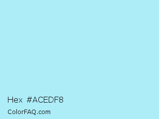 Hex #acedf8 Color is a very light cyan color and the nearest color is Pale Turquoise #afeeee. Hex code #acedf8 and RGB value is rgb(172,237,248). In RGB color space, this color is composed of 67% red, 93% green, 97% blue, In CMYK color space, this color is composed of 31% cyan, 4% magenta, 0% yellow , 3% black , In HSL color space, this color has a hue angle of 189° , 84% saturation and 82% lightness.