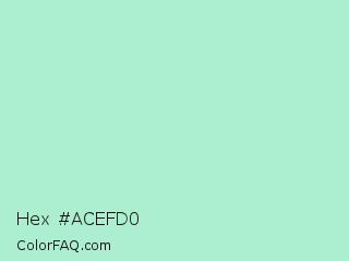 Hex #acefd0 Color is a very light green color and the nearest color is Magic Mint #aaf0d1. Hex code #acefd0 and RGB value is rgb(172,239,208). In RGB color space, this color is composed of 67% red, 94% green, 82% blue, In CMYK color space, this color is composed of 28% cyan, 0% magenta, 13% yellow , 6% black , In HSL color space, this color has a hue angle of 152° , 68% saturation and 81% lightness.