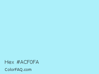 Hex #acf0fa Color is a very light cyan color and the nearest color is Waterspout #a4f4f9. Hex code #acf0fa and RGB value is rgb(172,240,250). In RGB color space, this color is composed of 67% red, 94% green, 98% blue, In CMYK color space, this color is composed of 31% cyan, 4% magenta, 0% yellow , 2% black , In HSL color space, this color has a hue angle of 188° , 89% saturation and 83% lightness.