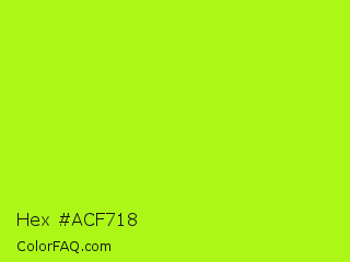 Hex #acf718 Color is a normal green color and the nearest color is Inch Worm #b0e313. Hex code #acf718 and RGB value is rgb(172,247,24). In RGB color space, this color is composed of 67% red, 97% green, 9% blue, In CMYK color space, this color is composed of 30% cyan, 0% magenta, 90% yellow , 3% black , In HSL color space, this color has a hue angle of 80° , 93% saturation and 53% lightness.