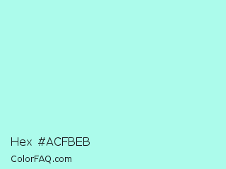 Hex #acfbeb Color is a very light cyan color and the nearest color is Ice Cold #b1f4e7. Hex code #acfbeb and RGB value is rgb(172,251,235). In RGB color space, this color is composed of 67% red, 98% green, 92% blue, In CMYK color space, this color is composed of 31% cyan, 0% magenta, 6% yellow , 2% black , In HSL color space, this color has a hue angle of 168° , 91% saturation and 83% lightness.