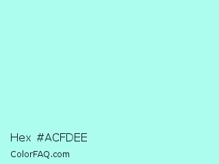 Hex #acfdee Color is a very light cyan color and the nearest color is Ice Cold #b1f4e7. Hex code #acfdee and RGB value is rgb(172,253,238). In RGB color space, this color is composed of 67% red, 99% green, 93% blue, In CMYK color space, this color is composed of 32% cyan, 0% magenta, 6% yellow , 1% black , In HSL color space, this color has a hue angle of 169° , 95% saturation and 83% lightness.