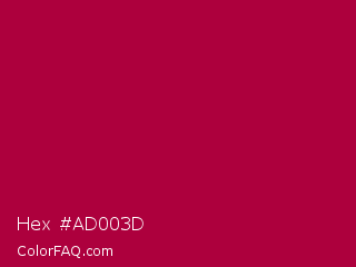 Hex #ad003d Color is a normal rose color and the nearest color is Shiraz #b20931. Hex code #ad003d and RGB value is rgb(173,0,61). In RGB color space, this color is composed of 68% red, 0% green, 24% blue, In CMYK color space, this color is composed of 0% cyan, 100% magenta, 65% yellow , 32% black , In HSL color space, this color has a hue angle of 339° , 100% saturation and 34% lightness.