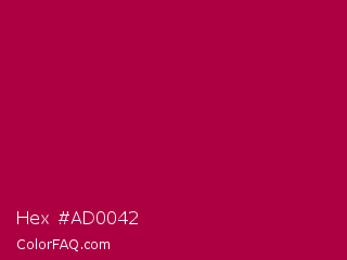 Hex #ad0042 Color is a normal rose color and the nearest color is Shiraz #b20931. Hex code #ad0042 and RGB value is rgb(173,0,66). In RGB color space, this color is composed of 68% red, 0% green, 26% blue, In CMYK color space, this color is composed of 0% cyan, 100% magenta, 62% yellow , 32% black , In HSL color space, this color has a hue angle of 337° , 100% saturation and 34% lightness.