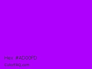 Hex #ad00fd Color is a normal purple color and the nearest color is Vivid Violet #9f00ff. Hex code #ad00fd and RGB value is rgb(173,0,253). In RGB color space, this color is composed of 68% red, 0% green, 99% blue, In CMYK color space, this color is composed of 32% cyan, 100% magenta, 0% yellow , 1% black , In HSL color space, this color has a hue angle of 281° , 100% saturation and 50% lightness.