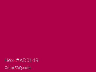 Hex #ad0149 Color is a normal rose color and the nearest color is Jazzberry Jam #a50b5e. Hex code #ad0149 and RGB value is rgb(173,1,73). In RGB color space, this color is composed of 68% red, 0% green, 29% blue, In CMYK color space, this color is composed of 0% cyan, 99% magenta, 58% yellow , 32% black , In HSL color space, this color has a hue angle of 335° , 99% saturation and 34% lightness.