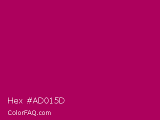Hex #ad015d Color is a normal rose color and the nearest color is Lipstick #ab0563. Hex code #ad015d and RGB value is rgb(173,1,93). In RGB color space, this color is composed of 68% red, 0% green, 36% blue, In CMYK color space, this color is composed of 0% cyan, 99% magenta, 46% yellow , 32% black , In HSL color space, this color has a hue angle of 328° , 99% saturation and 34% lightness.
