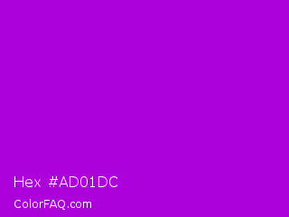 Hex #ad01dc Color is a normal purple color and the nearest color is Vivid Mulberry #b80ce3. Hex code #ad01dc and RGB value is rgb(173,1,220). In RGB color space, this color is composed of 68% red, 0% green, 86% blue, In CMYK color space, this color is composed of 21% cyan, 100% magenta, 0% yellow , 14% black , In HSL color space, this color has a hue angle of 287° , 99% saturation and 43% lightness.