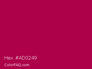 Hex #ad0249 Color is a normal rose color and the nearest color is Jazzberry Jam #a50b5e. Hex code #ad0249 and RGB value is rgb(173,2,73). In RGB color space, this color is composed of 68% red, 1% green, 29% blue, In CMYK color space, this color is composed of 0% cyan, 99% magenta, 58% yellow , 32% black , In HSL color space, this color has a hue angle of 335° , 98% saturation and 34% lightness.