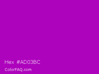 Hex #ad03bc Color is a normal magenta color and the nearest color is Heliotrope Magenta #aa00bb. Hex code #ad03bc and RGB value is rgb(173,3,188). In RGB color space, this color is composed of 68% red, 1% green, 74% blue, In CMYK color space, this color is composed of 8% cyan, 98% magenta, 0% yellow , 26% black , In HSL color space, this color has a hue angle of 295° , 97% saturation and 37% lightness.