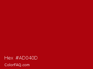 Hex #ad040d Color is a normal red color and the nearest color is Bright Red #b10000. Hex code #ad040d and RGB value is rgb(173,4,13). In RGB color space, this color is composed of 68% red, 2% green, 5% blue, In CMYK color space, this color is composed of 0% cyan, 98% magenta, 92% yellow , 32% black , In HSL color space, this color has a hue angle of 357° , 95% saturation and 35% lightness.