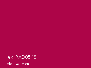 Hex #ad0548 Color is a normal rose color and the nearest color is Pictorial Carmine #c30b4e. Hex code #ad0548 and RGB value is rgb(173,5,72). In RGB color space, this color is composed of 68% red, 2% green, 28% blue, In CMYK color space, this color is composed of 0% cyan, 97% magenta, 58% yellow , 32% black , In HSL color space, this color has a hue angle of 336° , 94% saturation and 35% lightness.