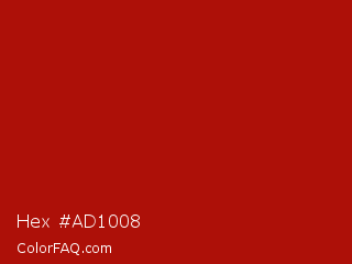 Hex #ad1008 Color is a normal red color and the nearest color is Mordant Red 19 #ae0c00. Hex code #ad1008 and RGB value is rgb(173,16,8). In RGB color space, this color is composed of 68% red, 6% green, 3% blue, In CMYK color space, this color is composed of 0% cyan, 91% magenta, 95% yellow , 32% black , In HSL color space, this color has a hue angle of 3° , 91% saturation and 35% lightness.