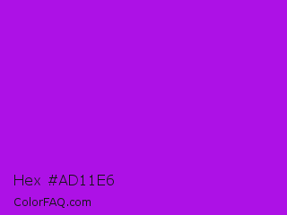 Hex #ad11e6 Color is a normal purple color and the nearest color is Vivid Mulberry #b80ce3. Hex code #ad11e6 and RGB value is rgb(173,17,230). In RGB color space, this color is composed of 68% red, 7% green, 90% blue, In CMYK color space, this color is composed of 25% cyan, 93% magenta, 0% yellow , 10% black , In HSL color space, this color has a hue angle of 284° , 86% saturation and 48% lightness.