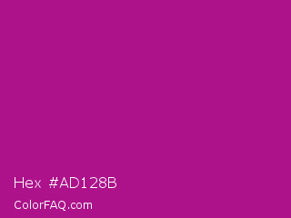 Hex #ad128b Color is a normal magenta color and the nearest color is Violet Eggplant #991199. Hex code #ad128b and RGB value is rgb(173,18,139). In RGB color space, this color is composed of 68% red, 7% green, 55% blue, In CMYK color space, this color is composed of 0% cyan, 90% magenta, 20% yellow , 32% black , In HSL color space, this color has a hue angle of 313° , 81% saturation and 37% lightness.
