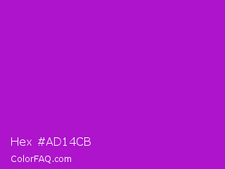 Hex #ad14cb Color is a normal purple color and the nearest color is Purple Munsell #9f00c5. Hex code #ad14cb and RGB value is rgb(173,20,203). In RGB color space, this color is composed of 68% red, 8% green, 80% blue, In CMYK color space, this color is composed of 15% cyan, 90% magenta, 0% yellow , 20% black , In HSL color space, this color has a hue angle of 290° , 82% saturation and 44% lightness.