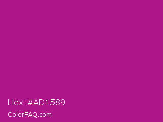 Hex #ad1589 Color is a normal magenta color and the nearest color is Violet Eggplant #991199. Hex code #ad1589 and RGB value is rgb(173,21,137). In RGB color space, this color is composed of 68% red, 8% green, 54% blue, In CMYK color space, this color is composed of 0% cyan, 88% magenta, 21% yellow , 32% black , In HSL color space, this color has a hue angle of 314° , 78% saturation and 38% lightness.