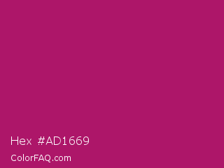 Hex #ad1669 Color is a normal magenta color and the nearest color is Jazzberry Jam #a50b5e. Hex code #ad1669 and RGB value is rgb(173,22,105). In RGB color space, this color is composed of 68% red, 9% green, 41% blue, In CMYK color space, this color is composed of 0% cyan, 87% magenta, 39% yellow , 32% black , In HSL color space, this color has a hue angle of 327° , 77% saturation and 38% lightness.