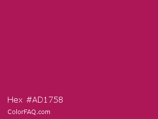 Hex #ad1758 Color is a normal rose color and the nearest color is Jazzberry Jam #a50b5e. Hex code #ad1758 and RGB value is rgb(173,23,88). In RGB color space, this color is composed of 68% red, 9% green, 35% blue, In CMYK color space, this color is composed of 0% cyan, 87% magenta, 49% yellow , 32% black , In HSL color space, this color has a hue angle of 334° , 77% saturation and 38% lightness.