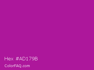 Hex #ad179b Color is a normal magenta color and the nearest color is Violet Eggplant #991199. Hex code #ad179b and RGB value is rgb(173,23,155). In RGB color space, this color is composed of 68% red, 9% green, 61% blue, In CMYK color space, this color is composed of 0% cyan, 87% magenta, 10% yellow , 32% black , In HSL color space, this color has a hue angle of 307° , 77% saturation and 38% lightness.