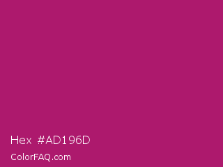 Hex #ad196d Color is a normal magenta color and the nearest color is Jazzberry Jam #a50b5e. Hex code #ad196d and RGB value is rgb(173,25,109). In RGB color space, this color is composed of 68% red, 10% green, 43% blue, In CMYK color space, this color is composed of 0% cyan, 86% magenta, 37% yellow , 32% black , In HSL color space, this color has a hue angle of 326° , 75% saturation and 39% lightness.