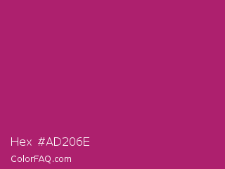 Hex #ad206e Color is a normal magenta color and the nearest color is Amaranth Deep Purple #9f2b68. Hex code #ad206e and RGB value is rgb(173,32,110). In RGB color space, this color is composed of 68% red, 13% green, 43% blue, In CMYK color space, this color is composed of 0% cyan, 82% magenta, 36% yellow , 32% black , In HSL color space, this color has a hue angle of 327° , 69% saturation and 40% lightness.