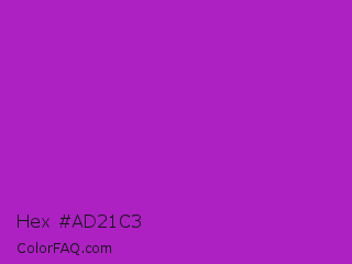 Hex #ad21c3 Color is a normal magenta color and the nearest color is Dark Orchid #9932cc. Hex code #ad21c3 and RGB value is rgb(173,33,195). In RGB color space, this color is composed of 68% red, 13% green, 76% blue, In CMYK color space, this color is composed of 11% cyan, 83% magenta, 0% yellow , 24% black , In HSL color space, this color has a hue angle of 292° , 71% saturation and 45% lightness.