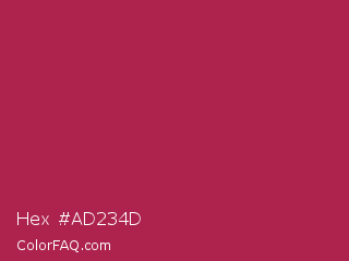 Hex #ad234d Color is a normal rose color and the nearest color is Amaranth Purple #ab274f. Hex code #ad234d and RGB value is rgb(173,35,77). In RGB color space, this color is composed of 68% red, 14% green, 30% blue, In CMYK color space, this color is composed of 0% cyan, 80% magenta, 55% yellow , 32% black , In HSL color space, this color has a hue angle of 342° , 66% saturation and 41% lightness.