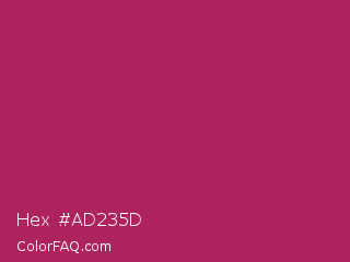 Hex #ad235d Color is a normal rose color and the nearest color is Rich Maroon #b03060. Hex code #ad235d and RGB value is rgb(173,35,93). In RGB color space, this color is composed of 68% red, 14% green, 36% blue, In CMYK color space, this color is composed of 0% cyan, 80% magenta, 46% yellow , 32% black , In HSL color space, this color has a hue angle of 335° , 66% saturation and 41% lightness.