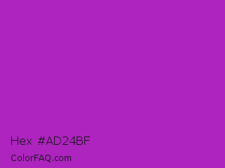 Hex #ad24bf Color is a normal magenta color and the nearest color is Dark Orchid #9932cc. Hex code #ad24bf and RGB value is rgb(173,36,191). In RGB color space, this color is composed of 68% red, 14% green, 75% blue, In CMYK color space, this color is composed of 9% cyan, 81% magenta, 0% yellow , 25% black , In HSL color space, this color has a hue angle of 293° , 68% saturation and 45% lightness.