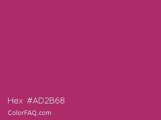 Hex #ad2b68 Color is a normal rose color and the nearest color is Rich Maroon #b03060. Hex code #ad2b68 and RGB value is rgb(173,43,104). In RGB color space, this color is composed of 68% red, 17% green, 41% blue, In CMYK color space, this color is composed of 0% cyan, 75% magenta, 40% yellow , 32% black , In HSL color space, this color has a hue angle of 332° , 60% saturation and 42% lightness.