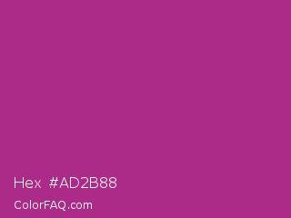 Hex #ad2b88 Color is a normal magenta color and the nearest color is Fandango #b53389. Hex code #ad2b88 and RGB value is rgb(173,43,136). In RGB color space, this color is composed of 68% red, 17% green, 53% blue, In CMYK color space, this color is composed of 0% cyan, 75% magenta, 21% yellow , 32% black , In HSL color space, this color has a hue angle of 317° , 60% saturation and 42% lightness.