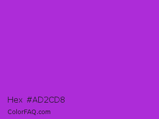Hex #ad2cd8 Color is a normal purple color and the nearest color is Dark Orchid #9932cc. Hex code #ad2cd8 and RGB value is rgb(173,44,216). In RGB color space, this color is composed of 68% red, 17% green, 85% blue, In CMYK color space, this color is composed of 20% cyan, 80% magenta, 0% yellow , 15% black , In HSL color space, this color has a hue angle of 285° , 69% saturation and 51% lightness.
