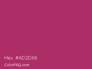 Hex #ad2d66 Color is a normal rose color and the nearest color is Rich Maroon #b03060. Hex code #ad2d66 and RGB value is rgb(173,45,102). In RGB color space, this color is composed of 68% red, 18% green, 40% blue, In CMYK color space, this color is composed of 0% cyan, 74% magenta, 41% yellow , 32% black , In HSL color space, this color has a hue angle of 333° , 59% saturation and 43% lightness.