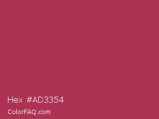 Hex #ad3354 Color is a normal rose color and the nearest color is Night Shadz #aa375a. Hex code #ad3354 and RGB value is rgb(173,51,84). In RGB color space, this color is composed of 68% red, 20% green, 33% blue, In CMYK color space, this color is composed of 0% cyan, 71% magenta, 51% yellow , 32% black , In HSL color space, this color has a hue angle of 344° , 54% saturation and 44% lightness.