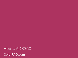 Hex #ad3360 Color is a normal rose color and the nearest color is Rich Maroon #b03060. Hex code #ad3360 and RGB value is rgb(173,51,96). In RGB color space, this color is composed of 68% red, 20% green, 38% blue, In CMYK color space, this color is composed of 0% cyan, 71% magenta, 45% yellow , 32% black , In HSL color space, this color has a hue angle of 338° , 54% saturation and 44% lightness.