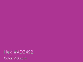 Hex #ad3492 Color is a normal magenta color and the nearest color is Fandango #b53389. Hex code #ad3492 and RGB value is rgb(173,52,146). In RGB color space, this color is composed of 68% red, 20% green, 57% blue, In CMYK color space, this color is composed of 0% cyan, 70% magenta, 16% yellow , 32% black , In HSL color space, this color has a hue angle of 313° , 54% saturation and 44% lightness.