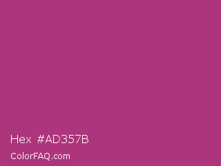 Hex #ad357b Color is a normal magenta color and the nearest color is Maximum Red Purple #a63a79. Hex code #ad357b and RGB value is rgb(173,53,123). In RGB color space, this color is composed of 68% red, 21% green, 48% blue, In CMYK color space, this color is composed of 0% cyan, 69% magenta, 29% yellow , 32% black , In HSL color space, this color has a hue angle of 325° , 53% saturation and 44% lightness.