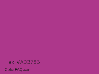 Hex #ad378b Color is a normal magenta color and the nearest color is Fandango #b53389. Hex code #ad378b and RGB value is rgb(173,55,139). In RGB color space, this color is composed of 68% red, 22% green, 55% blue, In CMYK color space, this color is composed of 0% cyan, 68% magenta, 20% yellow , 32% black , In HSL color space, this color has a hue angle of 317° , 52% saturation and 45% lightness.