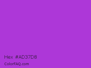 Hex #ad37d8 Color is a normal purple color and the nearest color is Dark Orchid #9932cc. Hex code #ad37d8 and RGB value is rgb(173,55,216). In RGB color space, this color is composed of 68% red, 22% green, 85% blue, In CMYK color space, this color is composed of 20% cyan, 75% magenta, 0% yellow , 15% black , In HSL color space, this color has a hue angle of 284° , 67% saturation and 53% lightness.