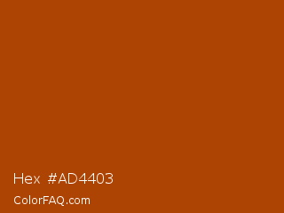 Hex #ad4403 Color is a normal orange color and the nearest color is Fire #aa4203. Hex code #ad4403 and RGB value is rgb(173,68,3). In RGB color space, this color is composed of 68% red, 27% green, 1% blue, In CMYK color space, this color is composed of 0% cyan, 61% magenta, 98% yellow , 32% black , In HSL color space, this color has a hue angle of 23° , 97% saturation and 35% lightness.