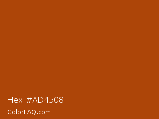 Hex #ad4508 Color is a normal orange color and the nearest color is Fire #aa4203. Hex code #ad4508 and RGB value is rgb(173,69,8). In RGB color space, this color is composed of 68% red, 27% green, 3% blue, In CMYK color space, this color is composed of 0% cyan, 60% magenta, 95% yellow , 32% black , In HSL color space, this color has a hue angle of 22° , 91% saturation and 35% lightness.