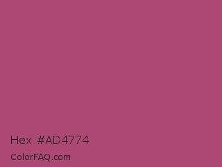 Hex #ad4774 Color is a normal rose color and the nearest color is Mystic Maroon #ad4379. Hex code #ad4774 and RGB value is rgb(173,71,116). In RGB color space, this color is composed of 68% red, 28% green, 45% blue, In CMYK color space, this color is composed of 0% cyan, 59% magenta, 33% yellow , 32% black , In HSL color space, this color has a hue angle of 334° , 42% saturation and 48% lightness.