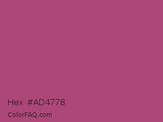 Hex #ad4778 Color is a normal rose color and the nearest color is Mystic Maroon #ad4379. Hex code #ad4778 and RGB value is rgb(173,71,120). In RGB color space, this color is composed of 68% red, 28% green, 47% blue, In CMYK color space, this color is composed of 0% cyan, 59% magenta, 31% yellow , 32% black , In HSL color space, this color has a hue angle of 331° , 42% saturation and 48% lightness.