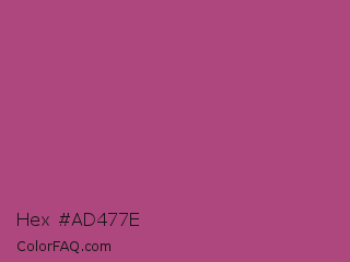 Hex #ad477e Color is a normal rose color and the nearest color is Mystic Maroon #ad4379. Hex code #ad477e and RGB value is rgb(173,71,126). In RGB color space, this color is composed of 68% red, 28% green, 49% blue, In CMYK color space, this color is composed of 0% cyan, 59% magenta, 27% yellow , 32% black , In HSL color space, this color has a hue angle of 328° , 42% saturation and 48% lightness.